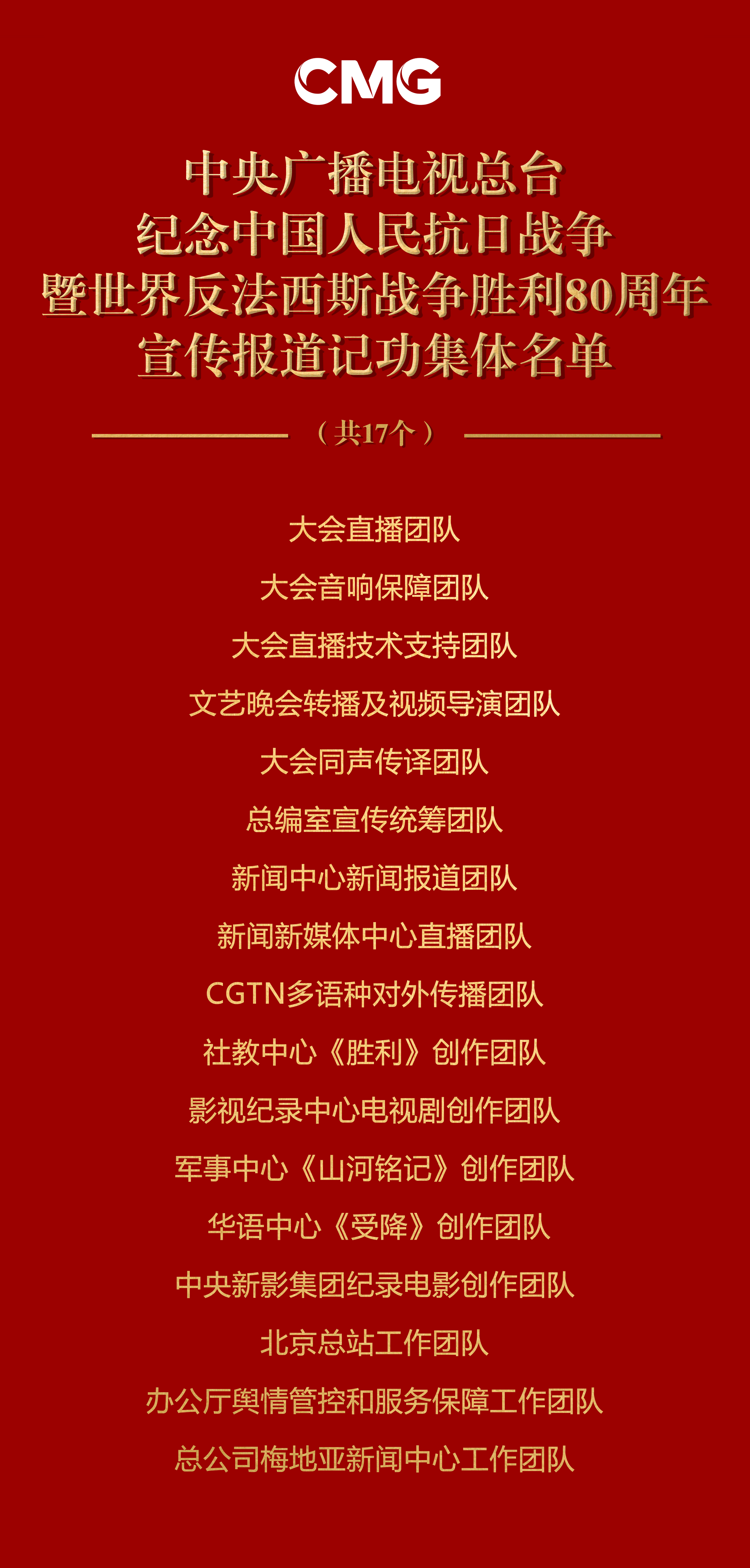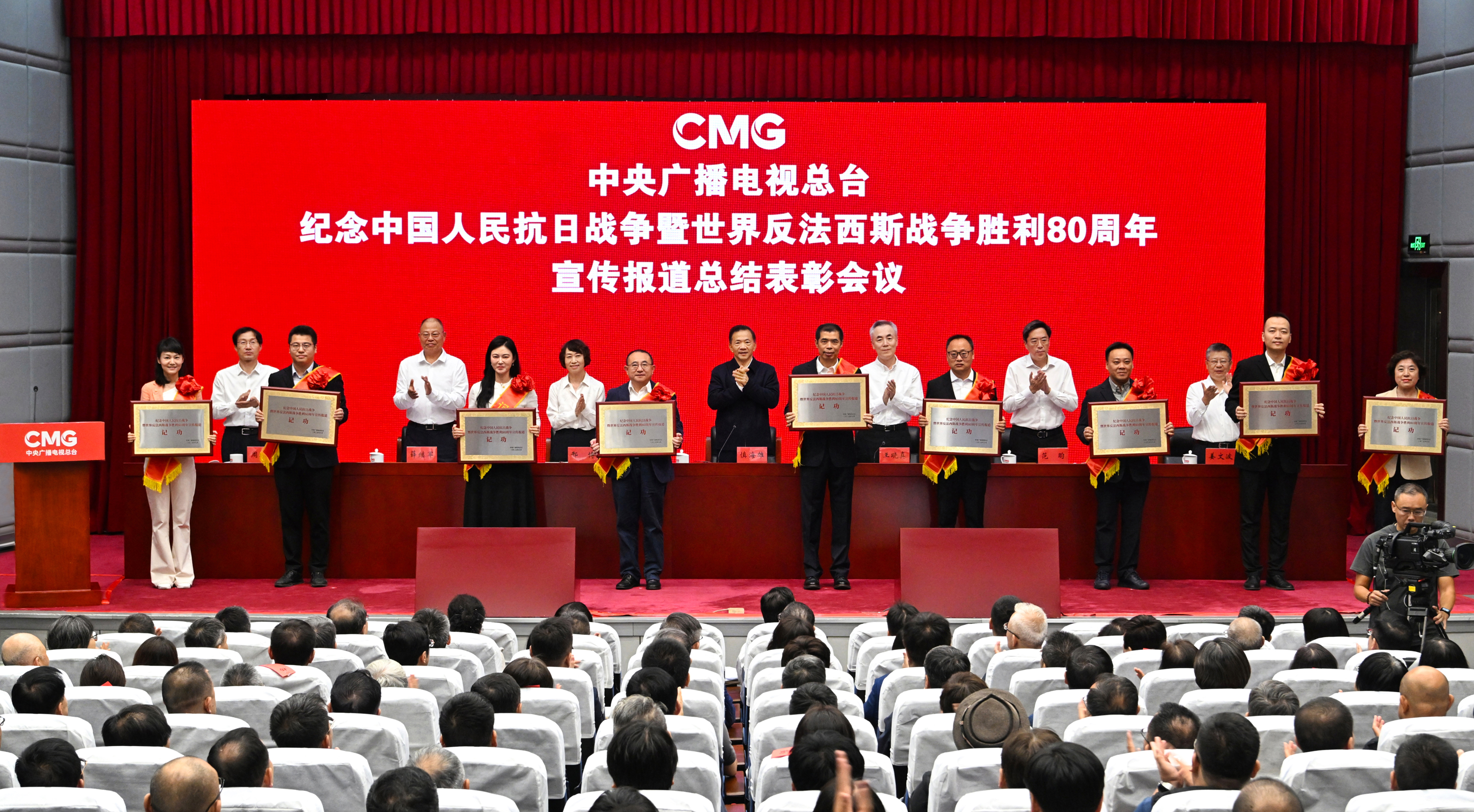 9月26日,中央广播电视总台召开纪念中国人民抗日战争暨世界反法西斯战争胜利80周年宣传报道总结表彰会议。中宣部副部长、中央广播电视总台党组书记、台长慎海雄出席会议并讲话。总台党组成员、副台长王晓真主持会议。总台党组成员、副台长邢博宣读表彰决定。总台党组成员、副总编辑范昀出席会议。