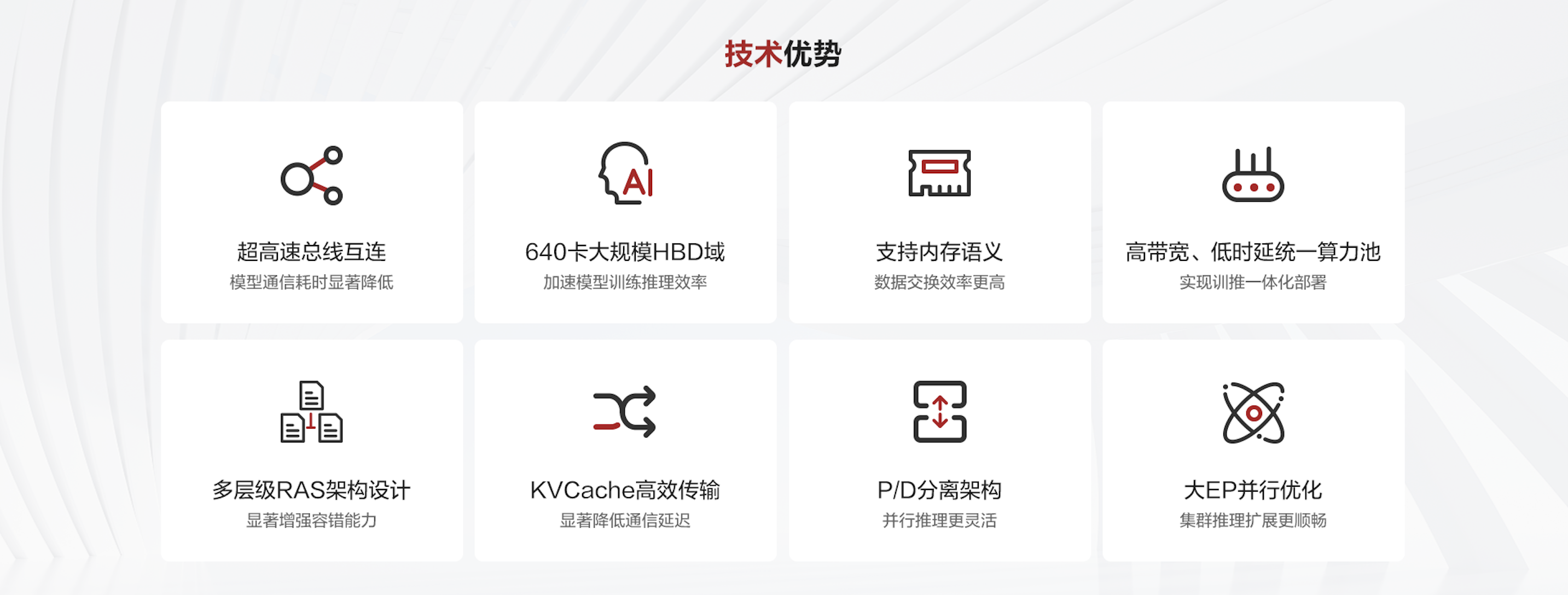 通过软硬协同全局优化,相比传统架构,实现MOE大模型训练效率与高通量推理吞吐性能大幅提升30-40%;通过采用超高速正交架构,超高密度刀片、浸没相变液冷、高压直流供电等多技术融合创新设计,成为业界最高集成度的液冷超节点,单机柜算力密度相比业界其他超节点最大提升20倍,PUE值低至1.04。