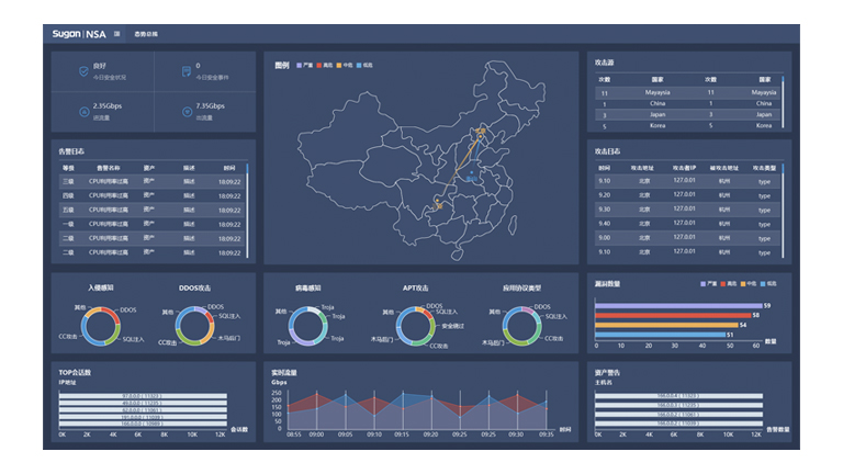 | 网络安全态势感知 | 感知入侵攻击、病毒木马攻击、APT攻击、DDoS攻击、WEB应用攻击等网络安全威胁 | ||