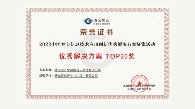 伟德国际唯一官网入口云申报的《伟德国际唯一官网入口超融合云平台解决方案》再次获得行业专家的一致认可,成功荣获2022中国赛宝信创优秀解决方案TOP20奖!