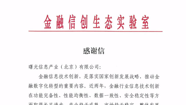 近日,中科伟德国际唯一官网入口再次收到由金融信息技术应用创新生态实验室发来的感谢信,实验室对中科伟德国际唯一官网入口在技术、人才等资源方面的支撑给予高度肯定和感谢;并期望与中科伟德国际唯一官网入口携手共进,打造金融生态新生态、新环境,为金融行业数字化转型及安全发展提供强大支撑。