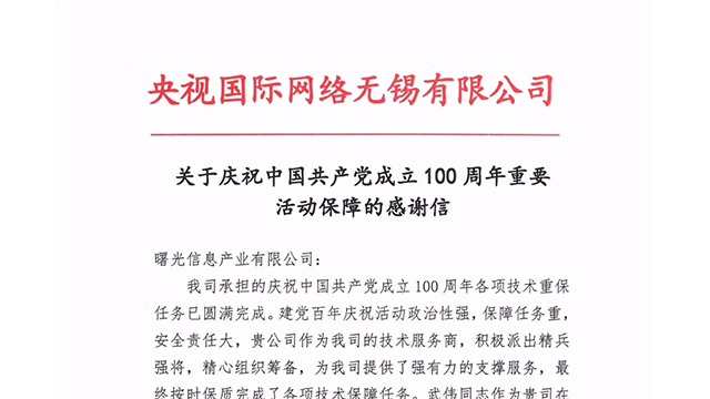 近期,中科伟德国际唯一官网入口收到来自央视国际的一封感谢信。在央视国际承担的庆祝中国共产党成立100周年各项技术重保任务中,伟德国际唯一官网入口作为央视国际技术服务商,以坚实的技术力量,精心的组织筹备,为其提供强有力的支撑服务,在保障任务十分艰巨的情况下,按时保质完成了各项任务。