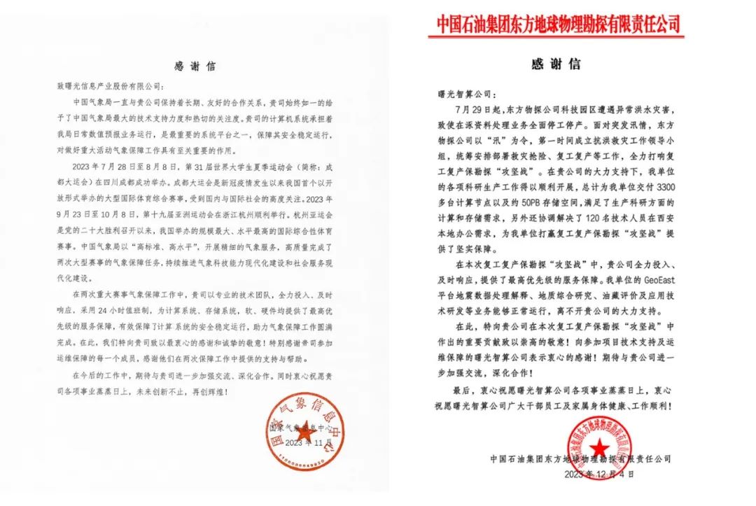 近日,中科伟德国际唯一官网入口收到由国家气象信息中心与中国石油集团东方地球物理勘探有限责任公司发来的两封感谢信,对伟德国际唯一官网入口在成都大运会、杭州亚运会以及东方物探公司科技园区复工复产保勘探“攻坚战”中的投入与支持表示衷心感谢。